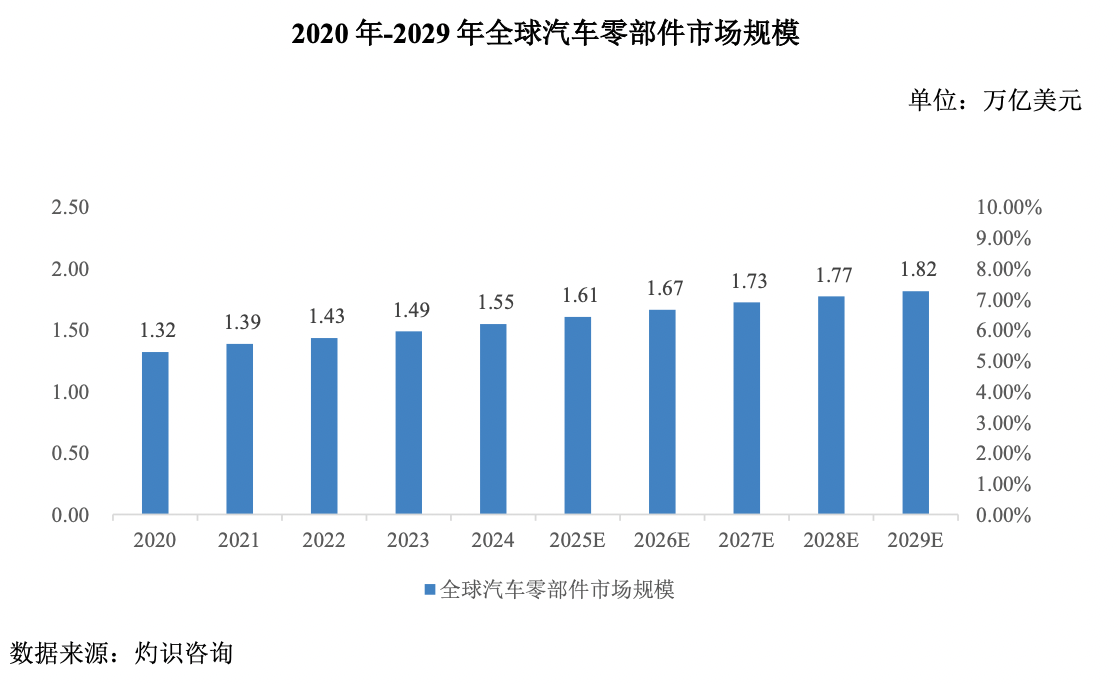 近年来,随着全球供应链产能恢复,全球汽车保有量和车龄的增长以及汽车产业技术的不断发展,全球汽车零部件市场保持持续增长趋势,根据灼识咨询数据,2024年全球汽车零部件市场约为1.55万亿美元,预计2024-2029年将保持3.23%的年均复合增长率,于2029年将达到1.82万亿美元的规模。