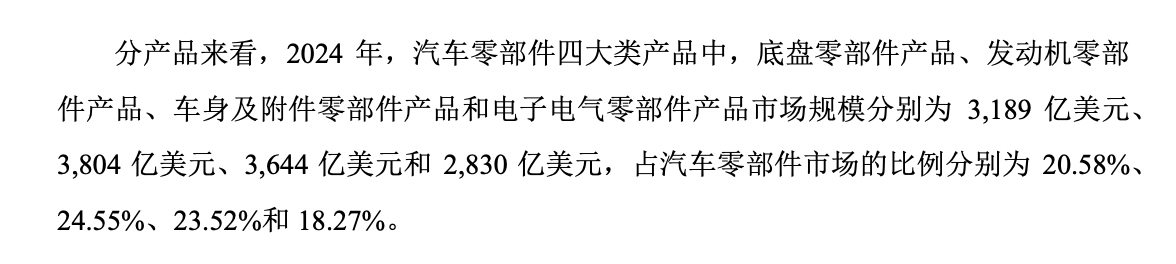 分产品来看,2024年,汽车零部件四大类产品中,底盘零部件产品、发动机零部件产品、车身及附件零部件产品和电子电气零部件产品市场规模分别为3,189亿美元、3,804亿美元、3,644亿美元和2,830亿美元,占汽车零部件市场的比例分别为20.58%、24.55%、23.52%和18.27%。